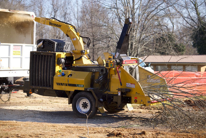 The Vermeer AX17 brush chipper is designed for the tree care contractor looking to do high production arborist work. Optimize crew size on the jobsite through mechanized feeding with horizontal off-set feed rollers and a fixed- infeed table. Plus, this single axle fully configured machine under 10,000 lb (4,536 kg) helps with transportation around congested urban areas.